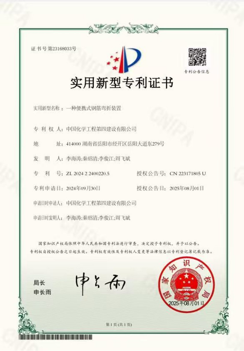 華東公司研發(fā)的“一種便攜式鋼筋彎折裝置”獲實(shí)用新型專利