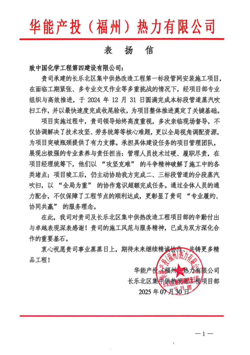近日,華能產(chǎn)投(福州)熱力有限公司向公司發(fā)來(lái)表?yè)P(yáng)信,對(duì)東北公司在福州華能項(xiàng)目建設(shè)中高效履約、主動(dòng)協(xié)同與敬業(yè)擔(dān)當(dāng)給予充分肯定和衷心感謝。