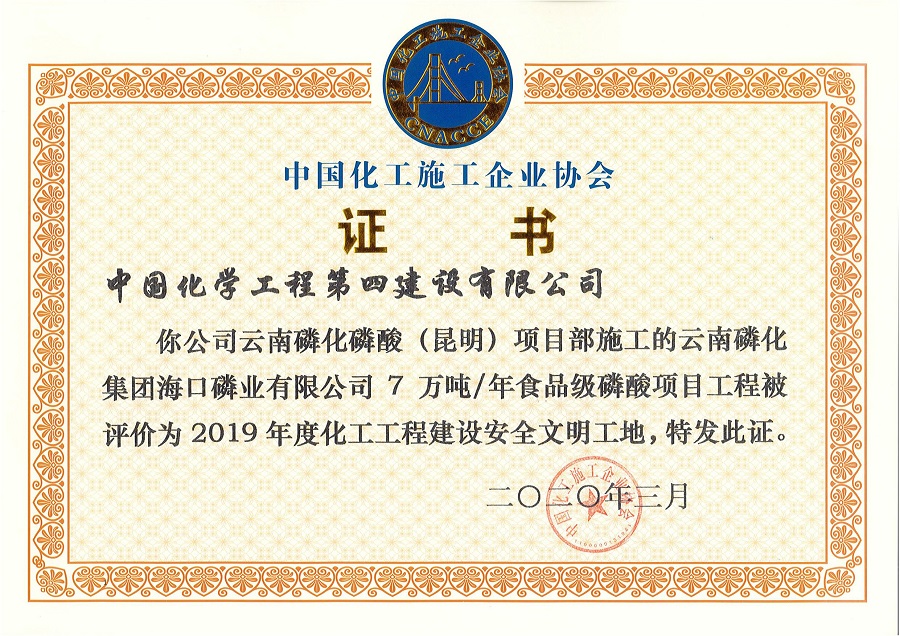 5月21日,西南分公司收到中國化工施工企業協會頒發的云南磷化海口磷業有限公司7萬噸/年食品級磷酸項目“2019年度化工工程建設安全文明工地”證書。