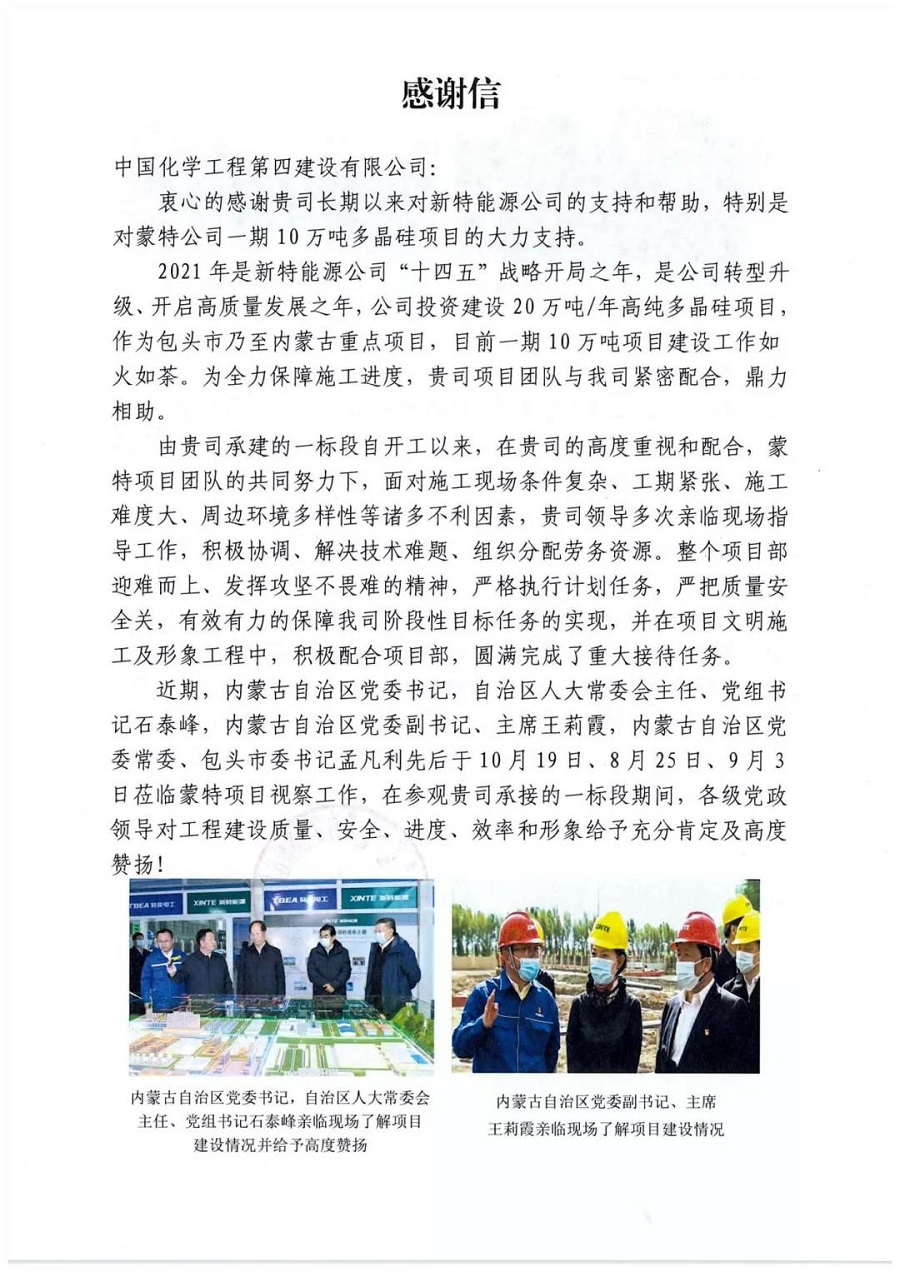 10月25日,西部分公司收到內蒙古新特硅材料有限公司《感謝信》。