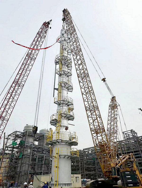 大連恒力項目苯酚丙酮裝置首臺穿衣戴帽塔器完成吊裝