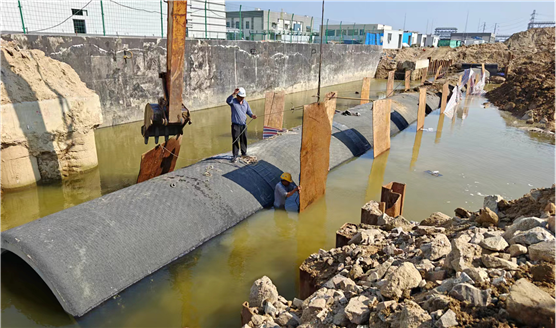 該雨水管道施工區域位于水下,管中線離海水僅有20米并與海相通,管道安裝難度大;同時,在開挖過程中,取水箱涵上面出現大量海水涌入導致土層坍塌。面對緊急情況,項目部連夜探討解決管道水中定位與對接問題,積極會商業主、監理單位,積極探索解決問題的路徑和方法,最后決定因“水”制宜,采取水下澆注混凝土來解決此難點。施工人員在箱涵上方處,通過對預應力鋼筒混凝土管兩端頭進行預制管枕施工,淤泥層及碎石處采取預制閥板墊層,挖集水坑進行強排,并且全程用GPS和全站儀進行精確測量標高和定位,確保雨水管道安裝的準確性和穩定性,順利完成管道水中施工作業。